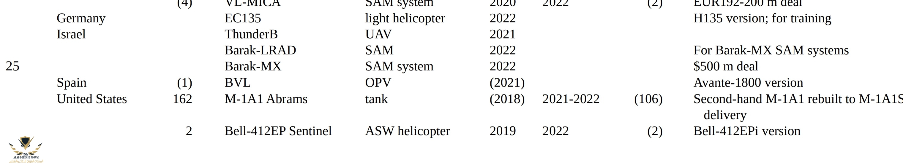 هناك اهتمام ب A400 لكن لا شيئ واضح للآنعلينا بطائرات التزويد بالوقود مثل الKC-135 Stratotanker ، طائرات النقل أيضا نحتاج النوع الاستراتيجي مثل الC-17 Globemaster أو الA-400M ، من ناحية البحرية ليس تخصصي و لكن القوات الجوية أتمنى لو نذهب للمخزون الأمريكي من الF-15E الذي سيخرج من الخدمة و تطويره مع إسرائيل بالكامل .