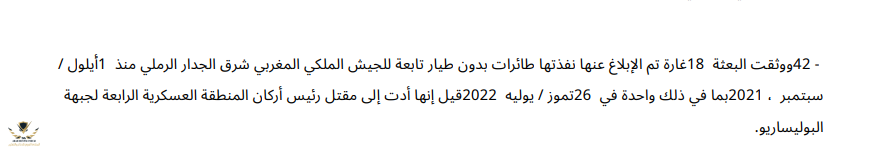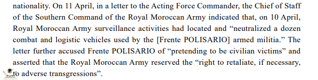 - المغرب أبلغ الأمم المتحدة في 10 أبريل بأنه قام بعملية عسكرية استباقية بعد تحديد انظمة الرصد لعدد من الاهداف أدت لتدمير عشرات المركبات القتالية و اللوجيسية لمرتزقة البوليساريو