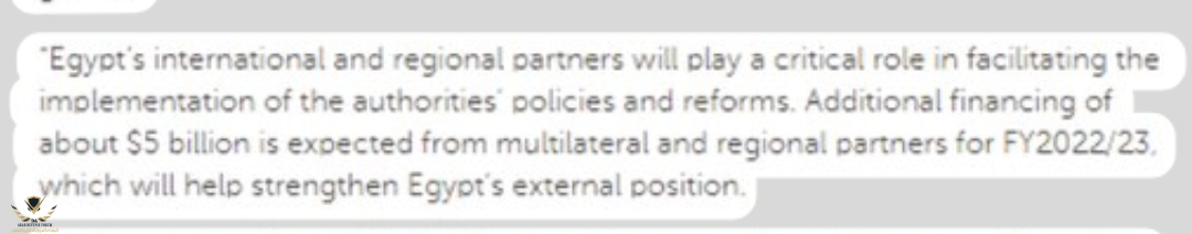 ‏"“Egypt’s international and regional partners will play a critical role in facilitating the implementation of the authorities’ policies and reforms. Additional financing of about $5 billion is expected from multilateral and regional partners for FY2022/23, which will help strengthen Egypt’s external position."