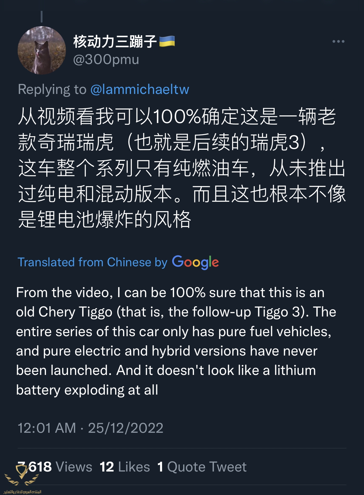 السياره ليست كهربائيه اصلا ، حتى الانفجار ليس لبطاريات ، ولا يمكن ان تنفجر بطاريه السياره بهذا الشكل لان بطاريه السياره عباره عن مجموعه كبيره جدا من البطاريات الصغيره ويستحيل تنفجر كلها او حتى نصها او ربعها بوقت واحد