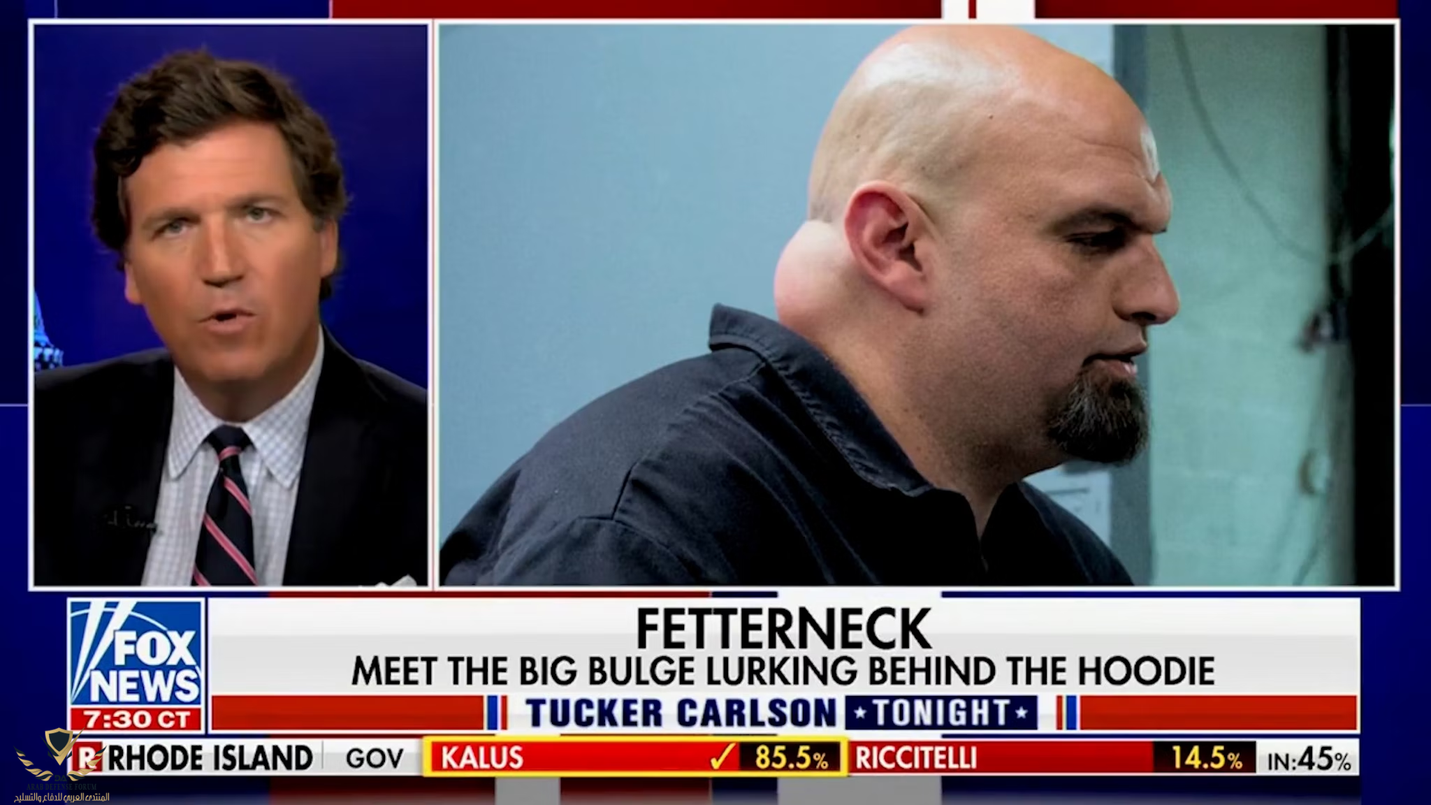 هنا تكر كارلسون يعاير نائب بنسليفينيا ان عنده جلطة وان رقبته تخوف.