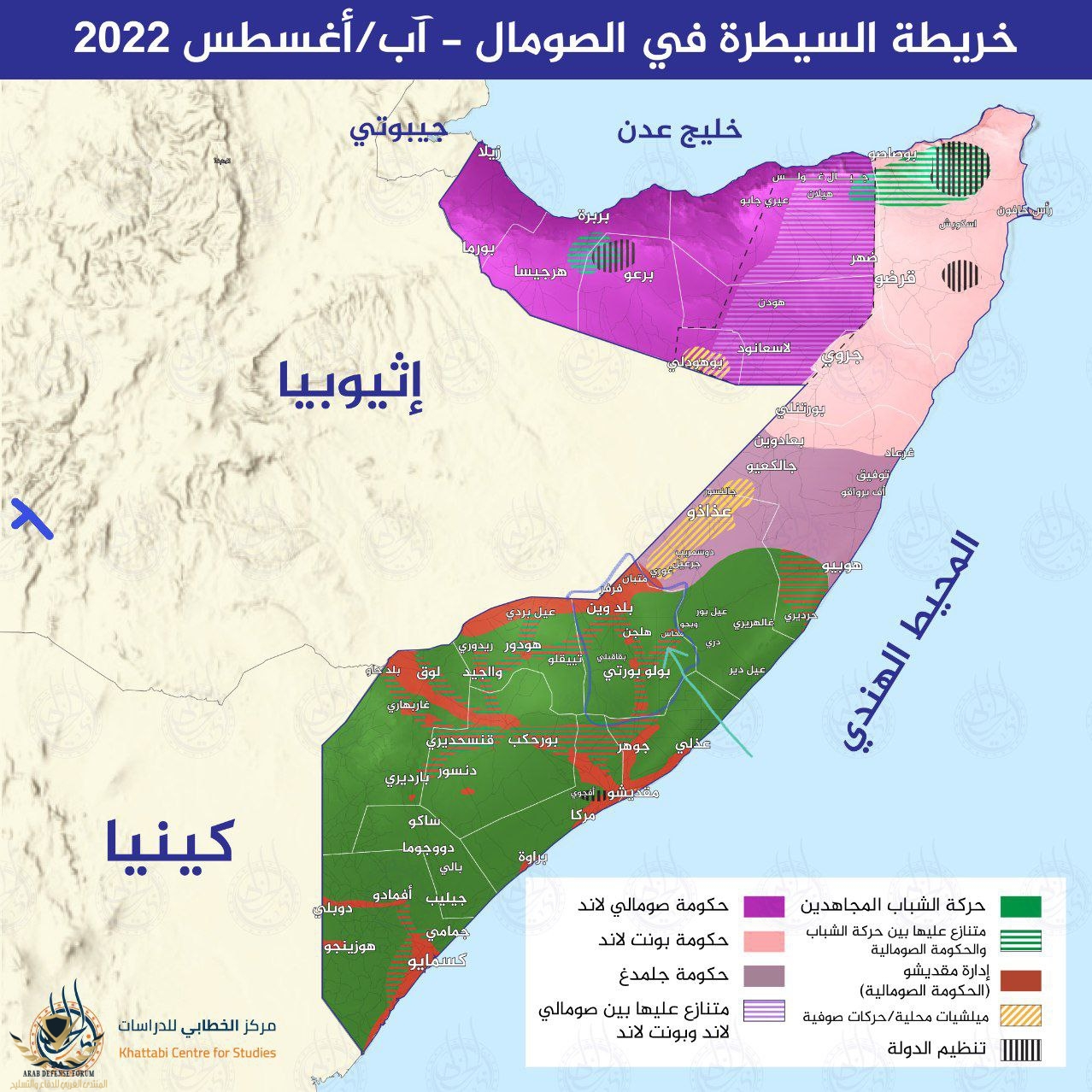 هذا تقسيم سيطرة في الصومال الحكومة الصومالية المعترف بها دوليا لا تسيطر إلا على أجزاء قليلة من الأرضها ولحركة الشباب نصيب الأسد من السيطرة والحكومة الصومالية مع الأسف تعيش تحت حماية القوات الإفريقية بسبب ضعف الجيش الصومالي رغم دعم التركي القطري له
