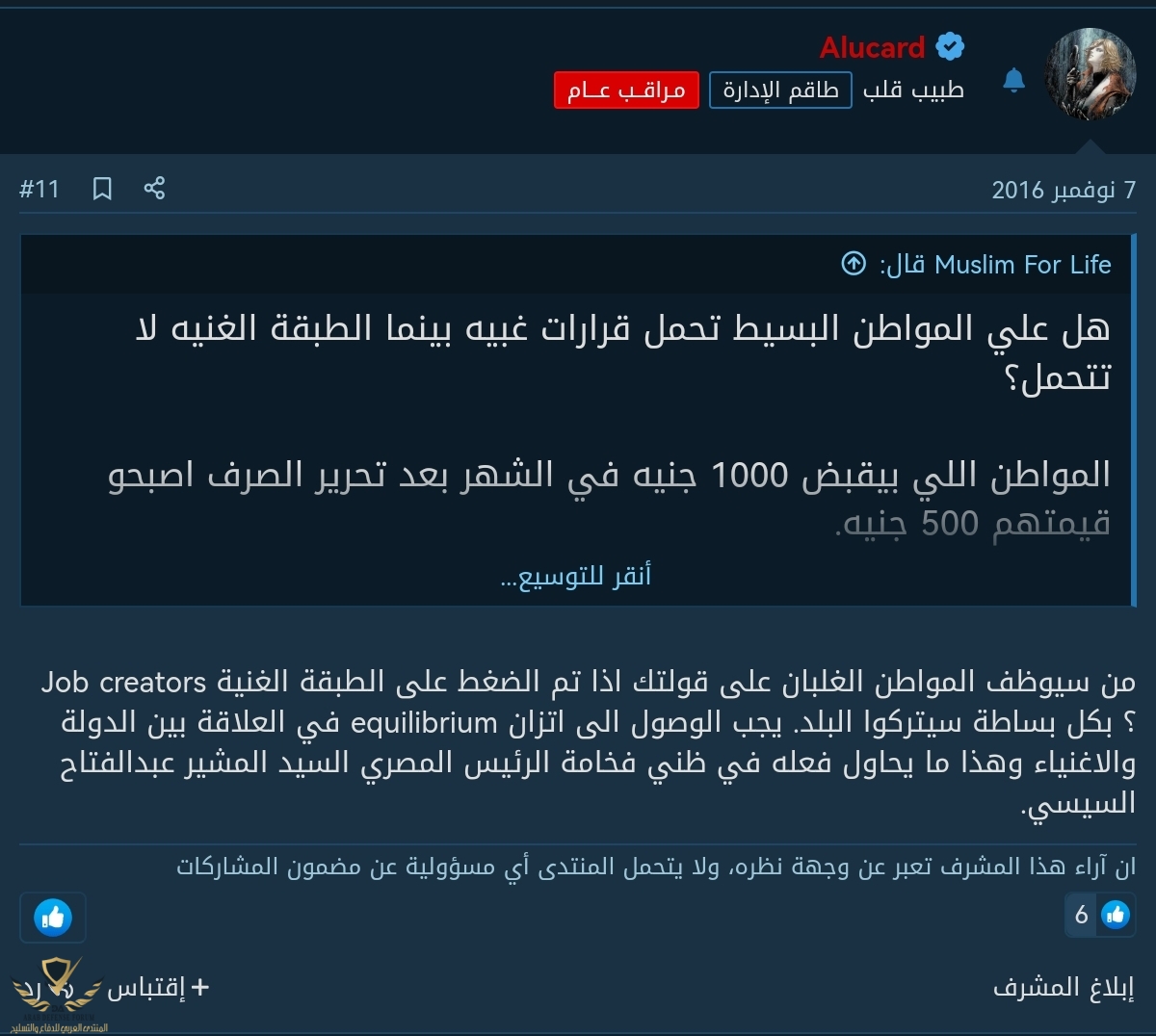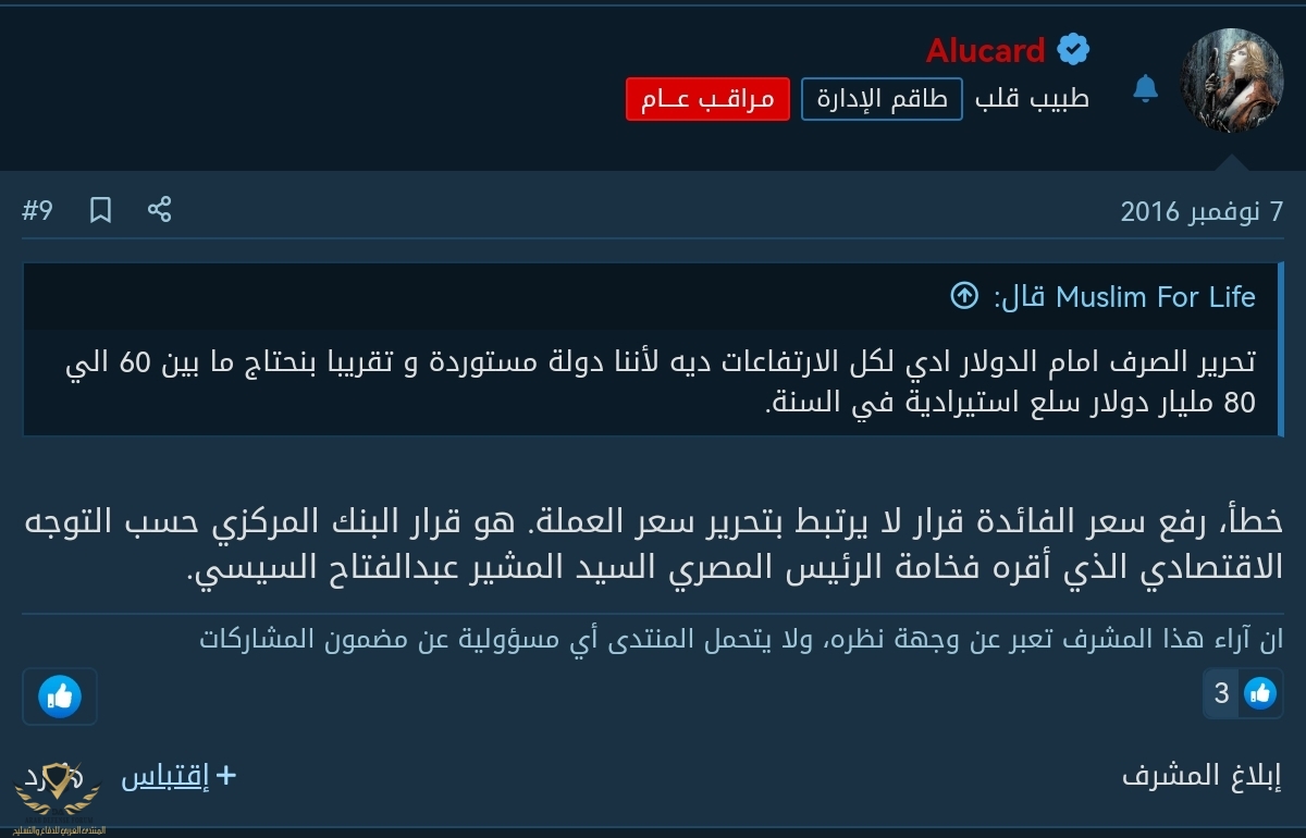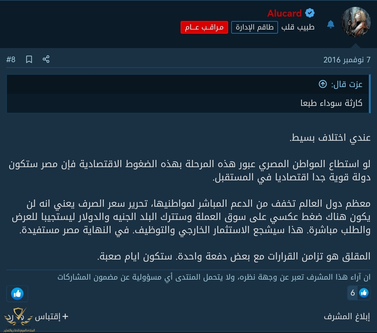 الغريب ياحج@Nighthawk ان في التعويم الاول الاخ عزت اللي قولت علية مؤيد للحكومة اعترض و قال انه كارثة في حين الاخ الوكارد قال انه حلو