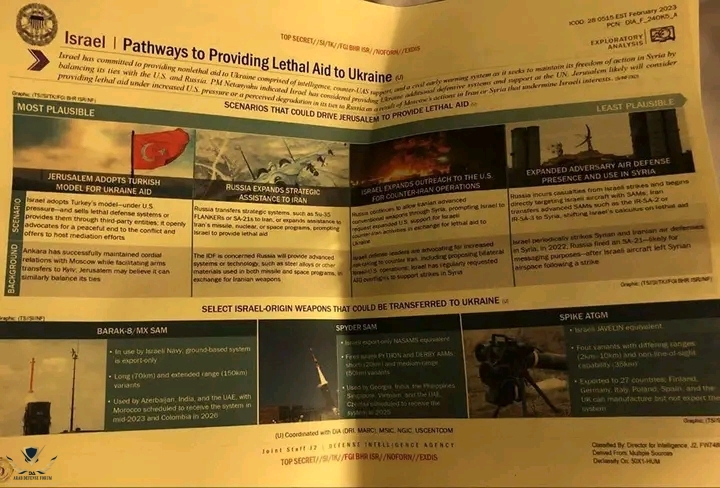 ظهر اسم المغرب في أحد الوثائق المسربة من البنتاغون، بخصوص احتمال دعم إسرائيلي لأوكرانيا. حيث تؤكد الوثيقة أن المملكة قد تبدأ في تسلم نظام BARAK MX للدفاع الجوي المتوسط و البعيد المدى منتصف 2023.
