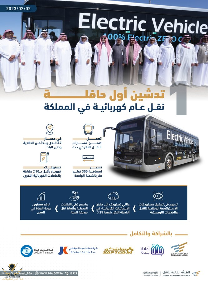 تدشين أول حافلة نقل كهربائية في السعودية ضمن مسار النقل العام في جدة،