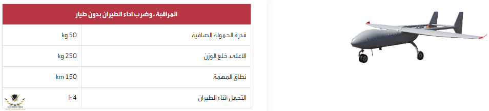 تمنحها بطارياتها مدة طيران تتراوح من 45 إلى 60 دقيقة ، اعتمادًا على الارتفاع الذي يتم إطلاقه ، ويتباطأ على ارتفاع 250 مترًا. يمكن أن تعمل حتى 50 كم من الطائرة بدون طيار والتي تنقل الإشارة من كاميرا نهارية / ليلية إلى محطة التحكم الأرضية.