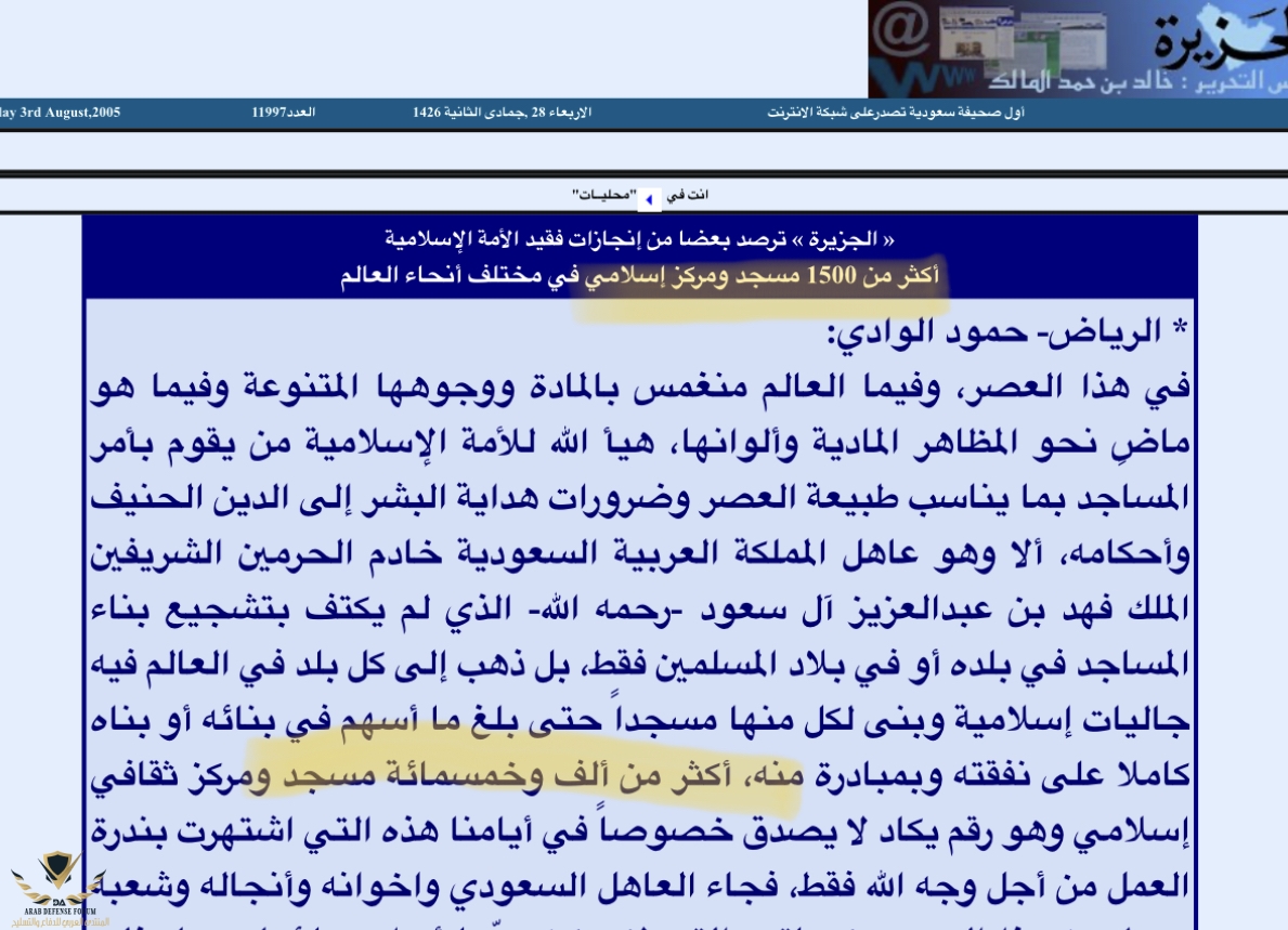 هذا غير الاخبار عام 2005 التي تقول ان الملك فهد بن عبدالعزيز وحده قام ببناء 1500 مسجد ومركز اسلامي دعوي في العالم