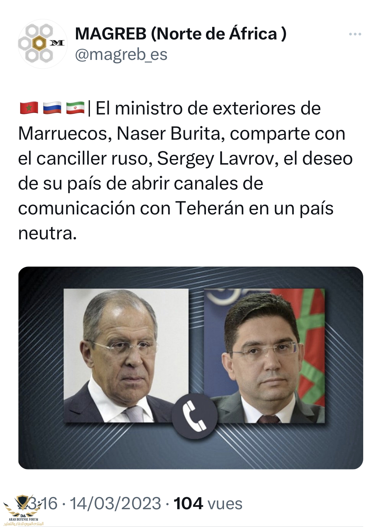ولا يهمك يا عزيزيضع المصدر الروسي الرسمي الذي يتحدت عن الخبر ويتحدت عن طلب مغربي بفتح قناة اتصال مع ايرانولا تضع لي اخبار مجهولة من تويتر