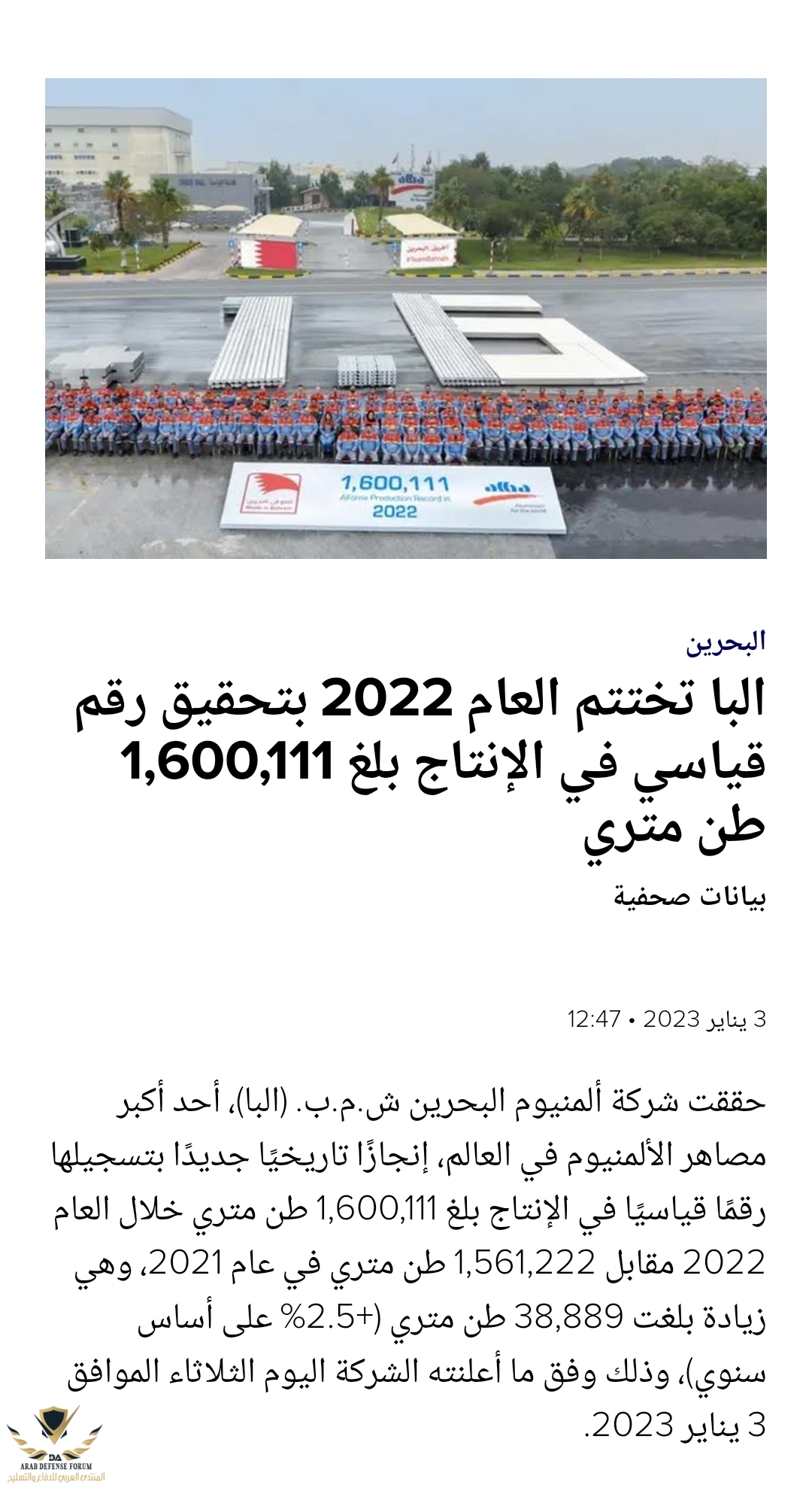 خبر جديد نشر قبل يومين مفاده أن شركة ألمنيوم البحرين "ألبا" واصلت تحقيق نتائج قياسية ولافتة لتحافظ على صدارتها في الطليعة من بين أكثر 10 شركات بحرينية ربحية، وتصدرت 10 شركات بحرينية قائمة الشركات الأعلى ربحية على مستوى الشركات المدرجة في بورصة البحرين، ففي قطاع الألمنيوم جاءت شركة ألمنيوم البحرين "ألبا" في الصدارة حيث حققت أرباحاً بلغت 416 مليون دينار.
