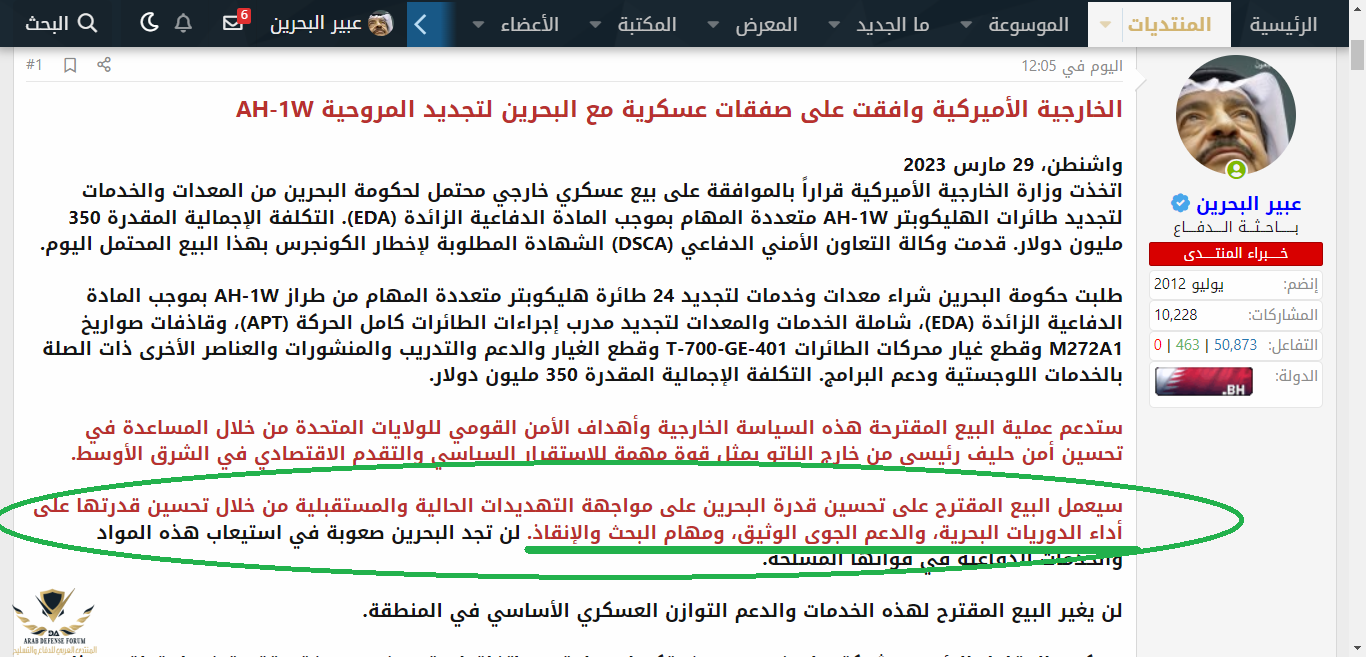 بحسب الرابط في عام 2020م كان في بيع أو منحة للبحرين من خلال المادة EDA للبحرية،