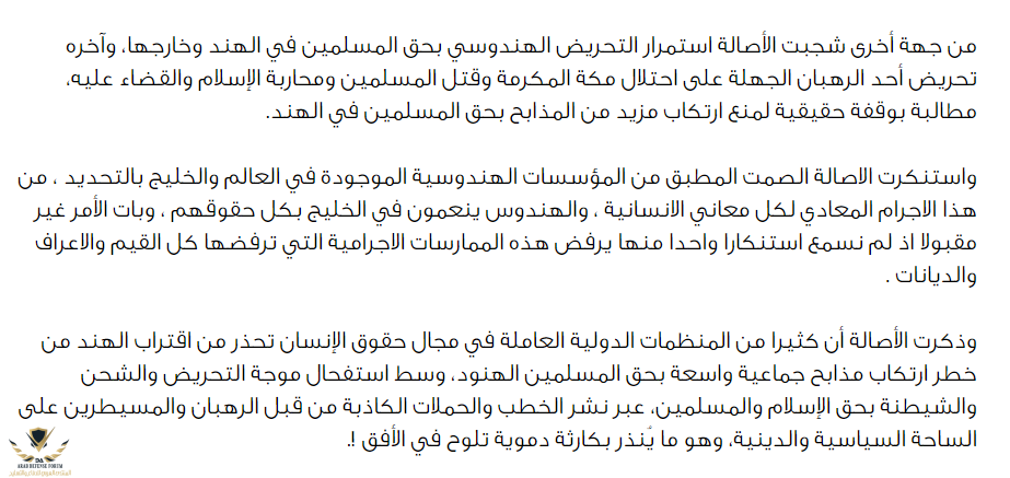 وفيما يخص التحريض الهندوسي بحق المسلمين وما قاله أحد الرهبان الهندوس بخصوص احتلال مكة المكرمة قالت جمعية الأصالة في بيانها