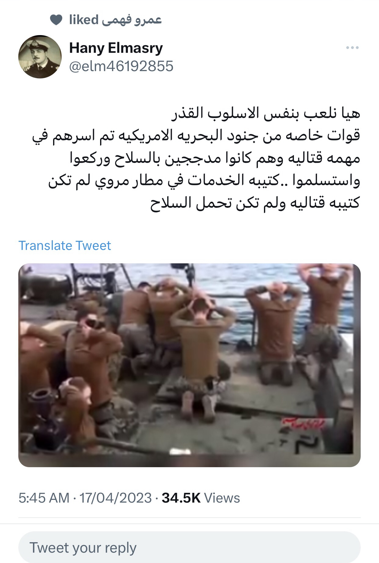 الشق اكبر من ترقيعك يا وائل أحنا أصبحنا طيشة بنتهان من كلاب السككالموضوع عادي جدا 20 فرد حراسات ببلد اجنبيه لقاعده دوله اجنبيه عادي يستسلمو ويتم اسرهم ليس من الضروره ان تقوم حرب وغزو بلد كامل من اجلهم امريكا القوى الاكبر في العالم ام اسر جنود قوات خاصه بحريه لهم باسلحتهم من قبل البحريه الايرانيه ولم تغزوا امريكا ايران او ندمها بالطائرات