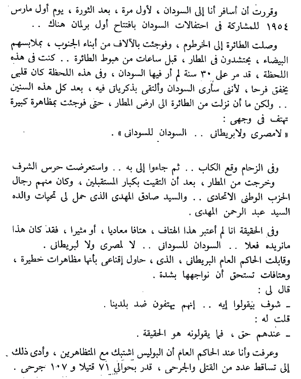 - فى صفحة 292 من التنقيح الثالث لمذكرات الرئيس الراحل " محمد نجيب " الصادرة بعنوان " كنت رئيساً لمصر " والتى تُعتبر المرجع الرئيسى لكل خصوم الرئيس جمال عبد الناصر ، يصف الرئيس نجيب وقائع أول زيارة له للسودان بعد الثورة ، والتى قام بها فى 1 مارس 1954 ، وكيف استقبله السودانيون وتعاملوا معه.