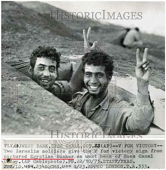 - صورة لجنود اسرائيلية يرفعون علامة النصر من خنادق الجيش المصري التي تركوها لهم وهربو.
