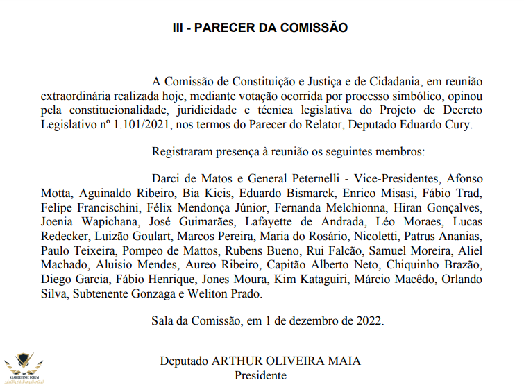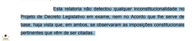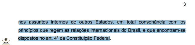 "الفقرات التي تشير إلى مبادئ احترام السيادة و الوحدة الترابية بين الدول ، والمعاملة بالمثل والمصالح المشتركة ، و سلامة حرمة الأراضي وعدم التدخل في الشؤون الداخلية للدول الأخرى ، هي تتطابق بالكامل مع المبادئ التي تحكم البرازيل في العلاقات الدولية ، والتي يتم ترتيبها في البند الرابع 4 من الدستور الاتحادي"