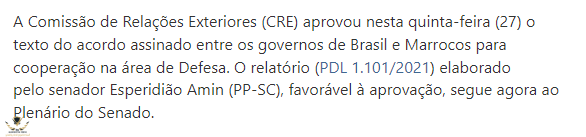 A Comissão de Relações Exteriores (CRE) aprovou nesta quinta-feira (27) o texto do acordo assinado entre os governos de Brasil e Marrocos para cooperação na área de Defesa. O relatório ( PDL 1.101/2021 ) elaborado pelo senador Esperidião Amin (PP-SC), favorável à aprovação, segue agora ao...