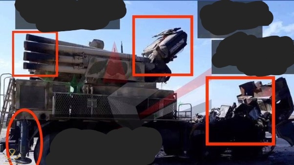 جزء من صاروخ المنظومة واضح فى الصورة مش محتاجة ذكاء يعنى والمنظومة ايضا عليها كيس لا اعلم ما يوجد داخله اى انها اما نها فى وضع عدم التشغيل او فى وضع تحرك ...هل تعلم الغيب لتعلم أنه صاروخان كان قبل التدمير !