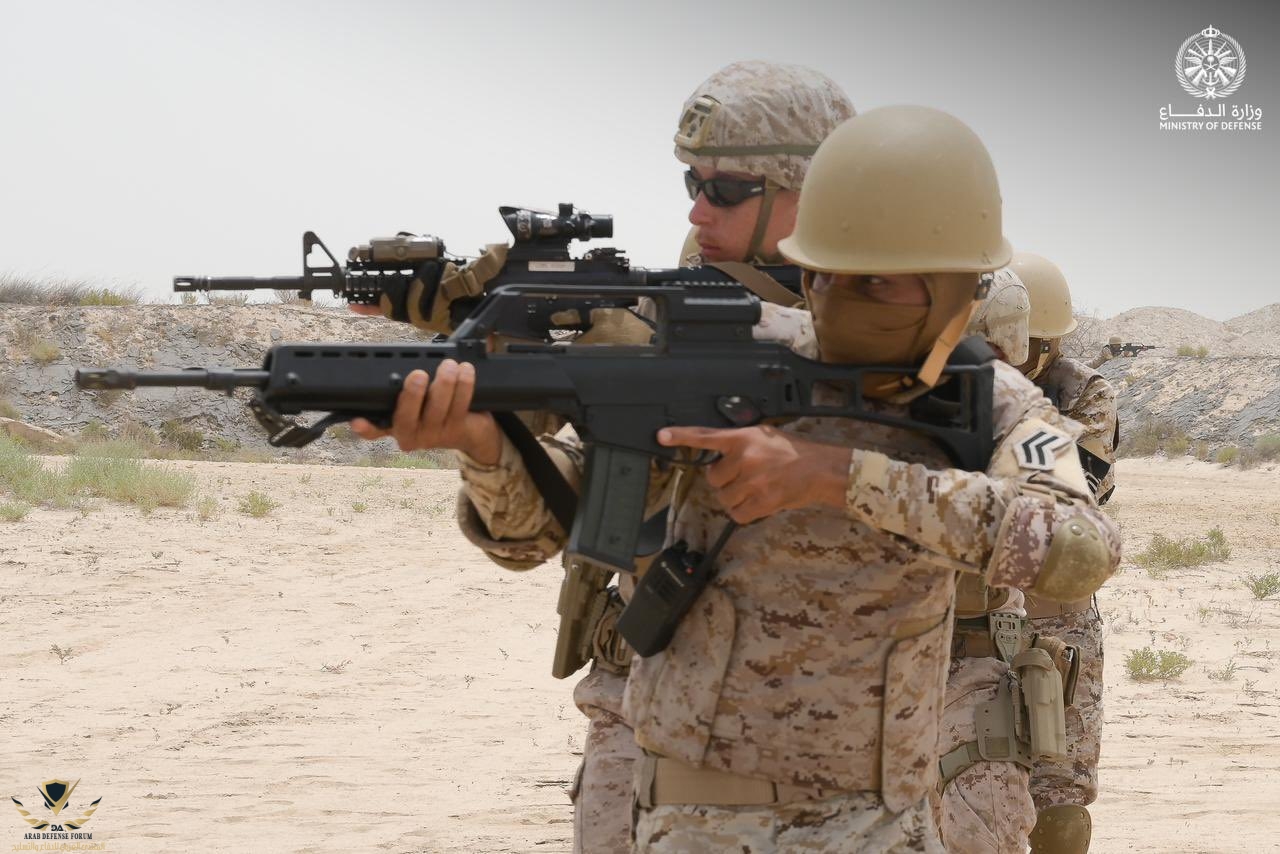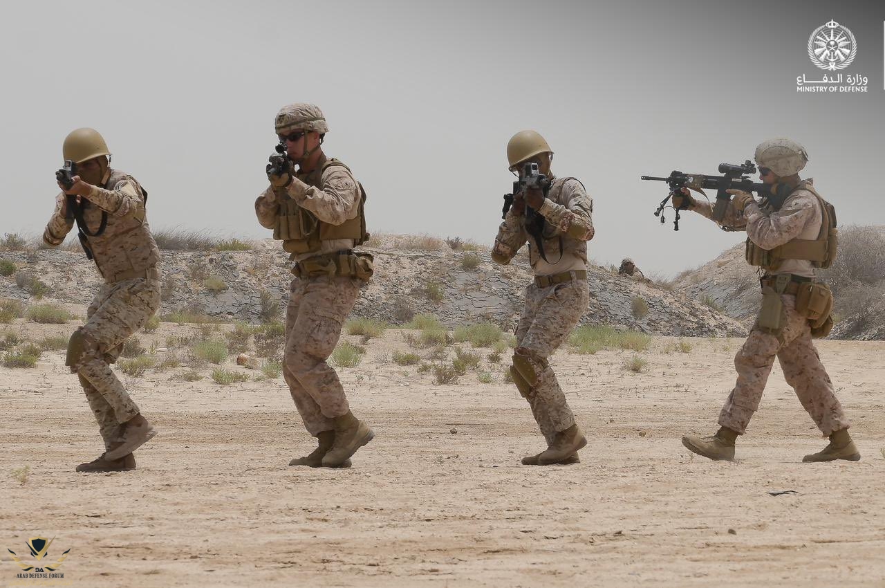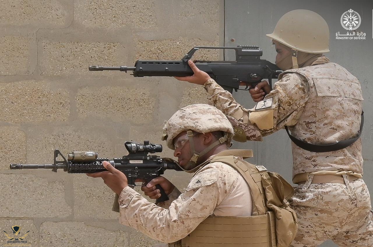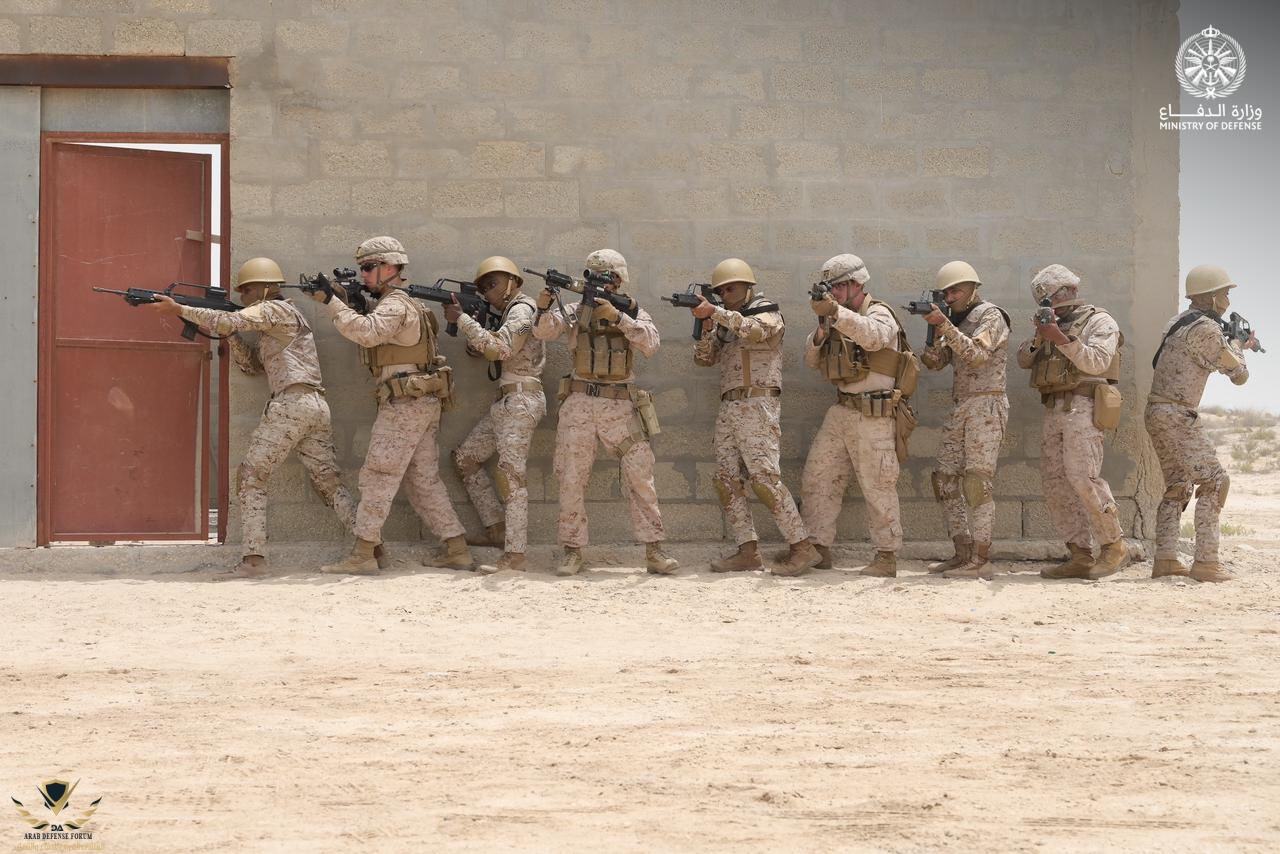 مشاة القوات البحرية الملكية السعودية ومشاة القوات البحرية الأمريكية، يُنفِّذان فرضية القتال في المناطق المبنية، ضمن فعاليات تمرين #عزم_النسر_23، الذي تستضيفه المملكة بقيادة القوات المسلحة ومشاركة دول مجلس التعاون والقوات الأمريكية.
