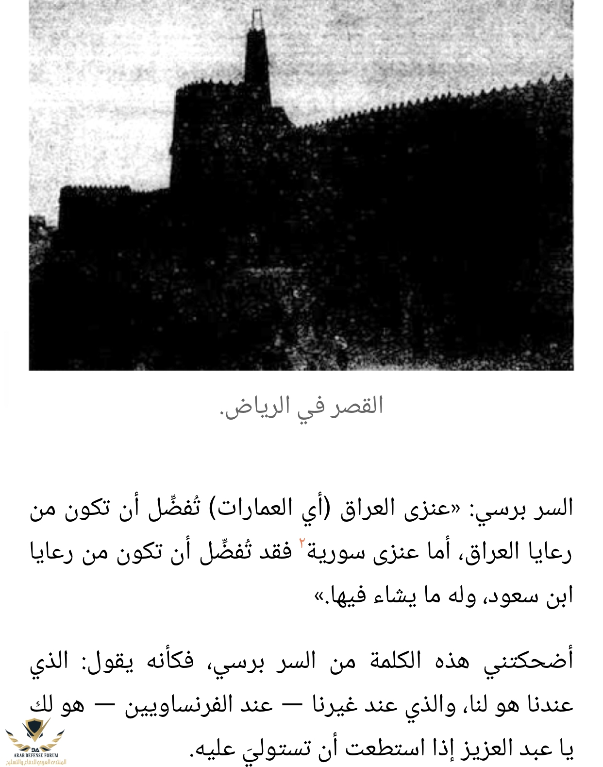 مهم كنا فيه نجلس ند بند معا البريطانيين في الصحراء وهم ممثلين مستعمراتهم بينما السعوديه يمثلها السلطان عبدالعزيز ال سعود وواضح العرض البريطاني (تبي تغزي سوريا وتاخذها حلالك بس نبي تترك لنا العراق وقبائله)