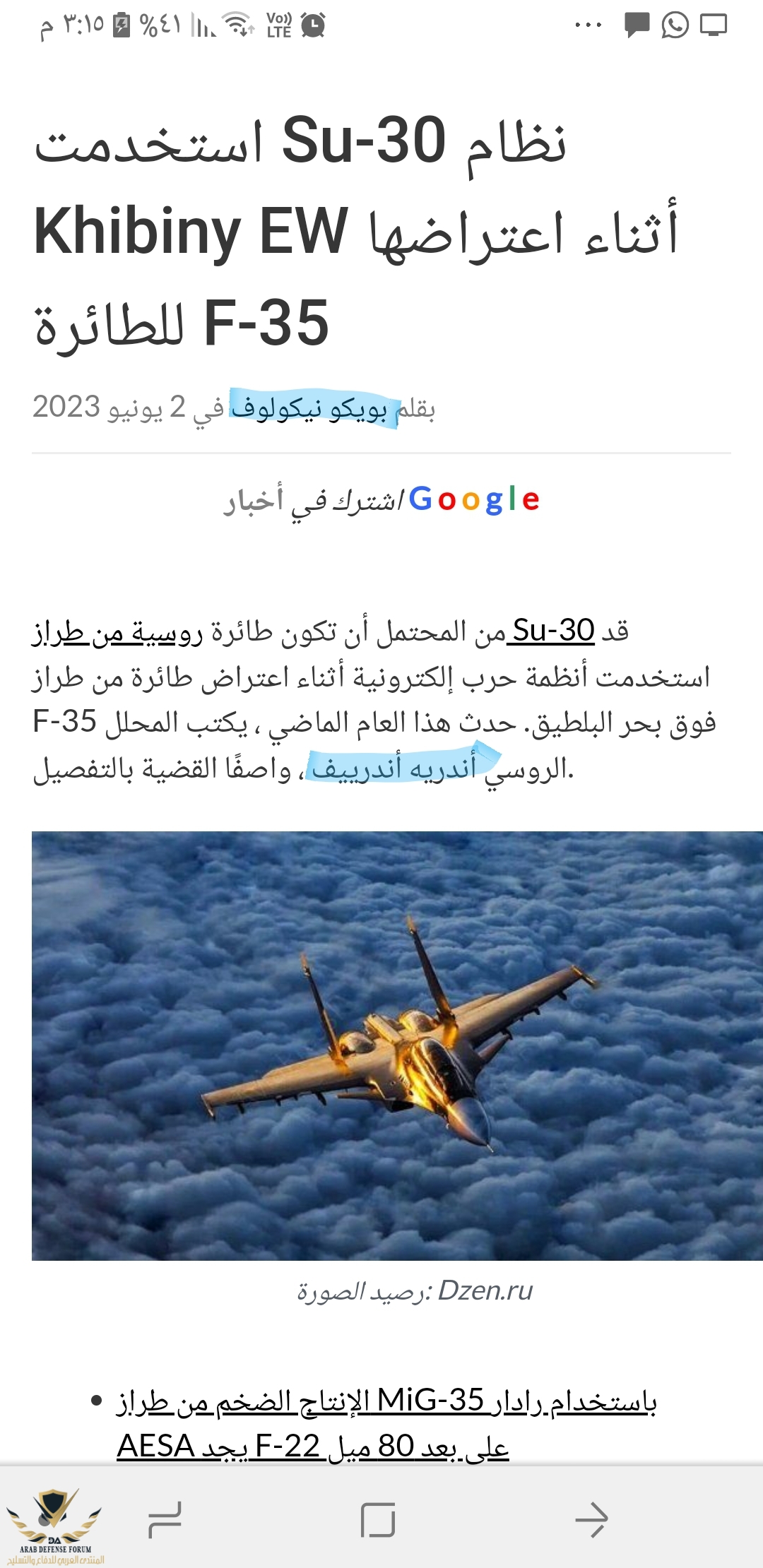 عزيزي ننتظر ارسال الامريكان للاف ١٦ الى اوكرانياخبر مضحك جدا وغير قابل للتصديق لان الاف-35 من خلال نظام DAS يمكنها اكتشاف وتتبع اي هدف جوي من عشرات ومئات الكيلومترات تبعا لنوع الهدف من خلال مجموعة من انظمة التصوير الحراري تغطي 360 درجة مما يعني ان الادعاء ان سوخوي-30 تختفي عن انظار طيار اف-35 مجرد هراءوالمضحك اكثر ان انظمة الحرب الالكترونية التي تحملها المقاتلات الروسية لم تكن قادرة على حماية هذه المقاتلات من انظمة الدفاع الجوي الاوكراني من اصول سوفيتية فكيف لها ان تشوش على انظمة الكشف للاف-35.