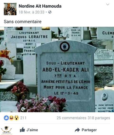 دون أن ننسى أنه لم يكن يقاتل الأجانب بل كان يقاتل من هم يفترض من نفس طينت الجزائرين( الثوار المقاوميين المسلمين)وماذا نسمي ماقاله جنرالكم خالد نزار أن والده شارك في حرب الريف ضد المقاومة مع الجيش الفرنسي