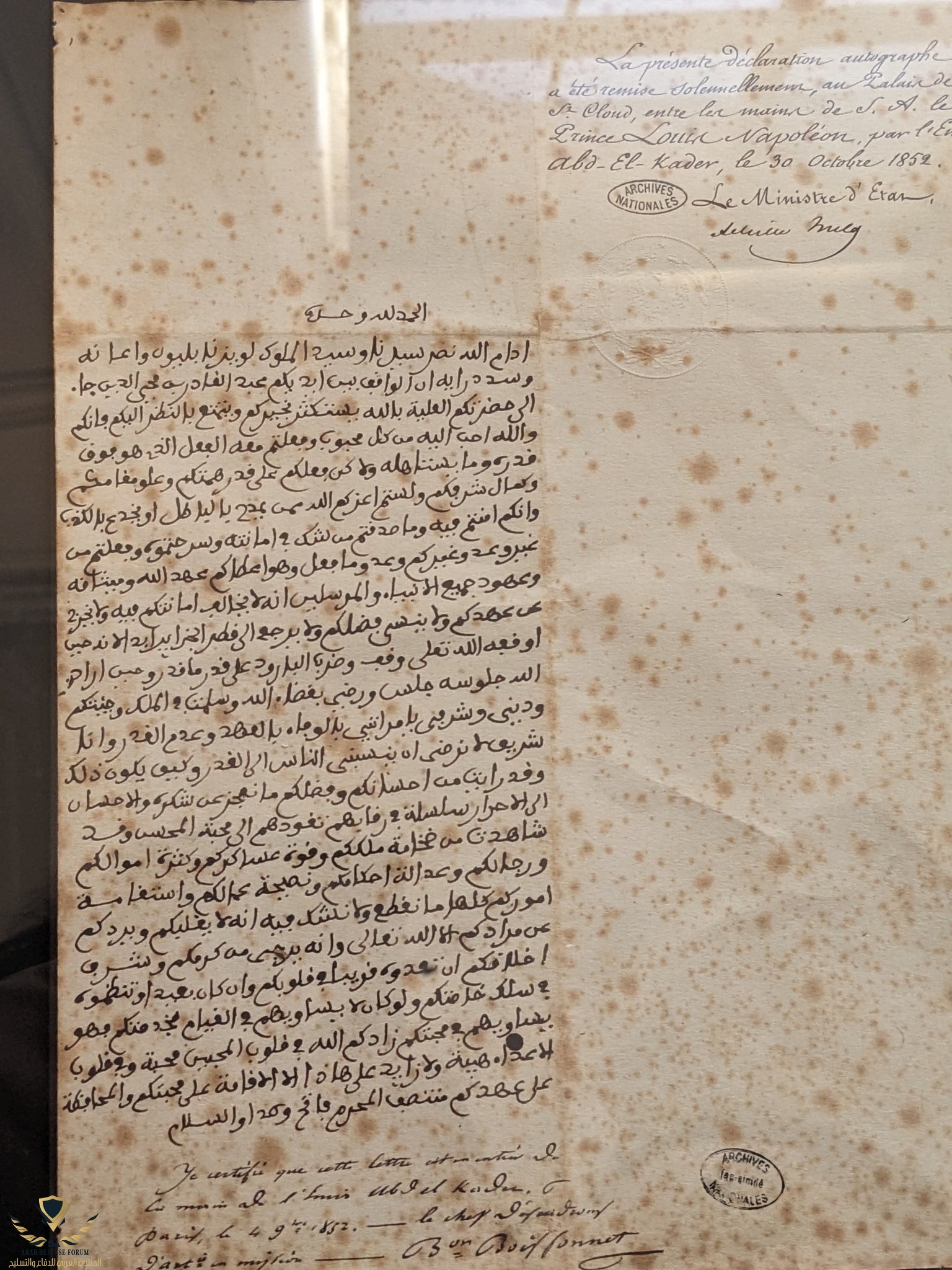 الاستقبال التاريخي لإمبراطور فرنسا نابوليون الثالث الأميرَ عبد القادر في قصره، وتسلم الإمبراطور معاهدة الأمير المكتوبة.