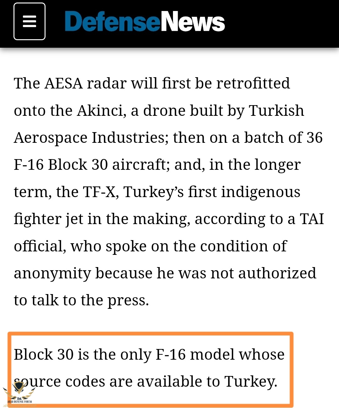 انا قلت ان أمريكا لابد أن توافق على منح source codes لتركيا اذا كانت ستقوم بتطوير bloc 30 ، والأستاذ صلاح الدين مشكورا ارفق في رده مصدر على منح تركيا الصلاحيه بالوصول الي كافة source codes لكل بلوكات f-16 التركيه
