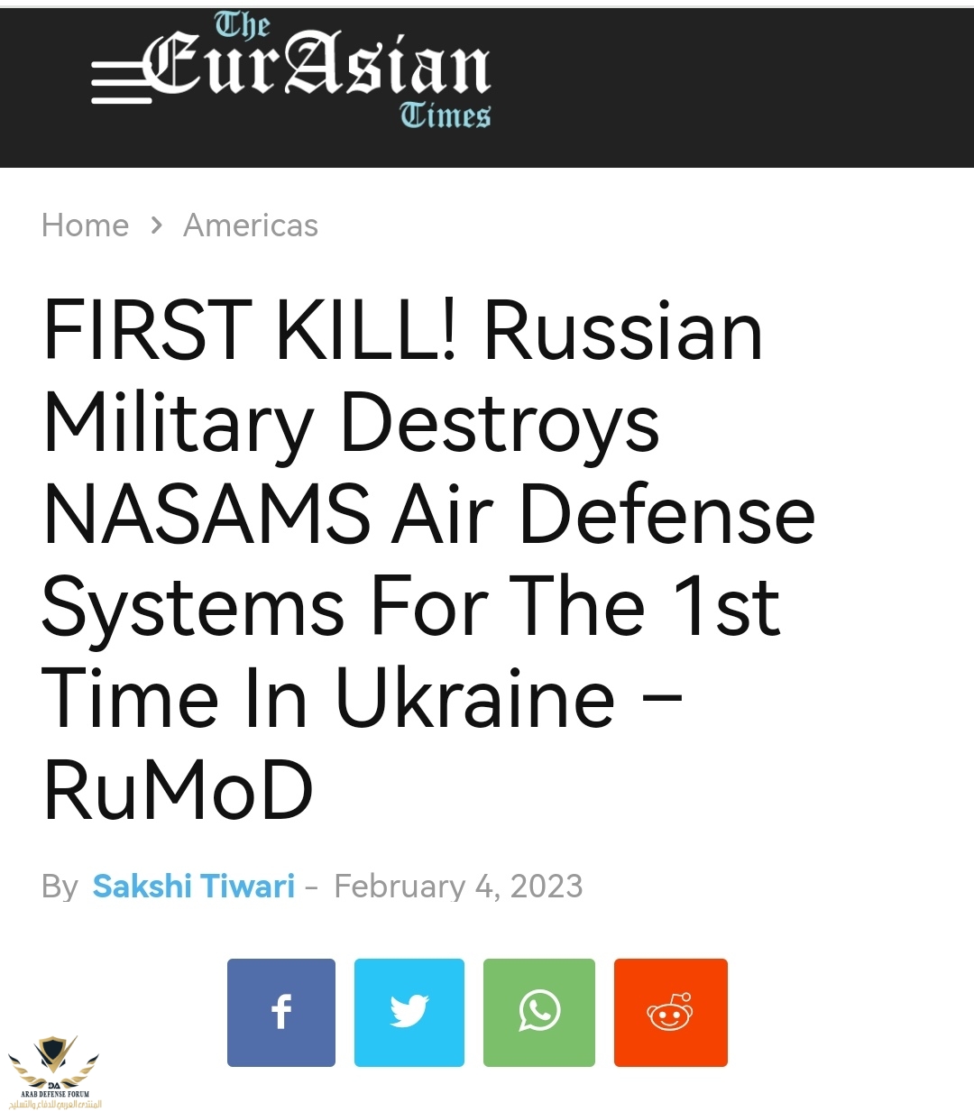 ثانيا - ربما هذا يفسر أيضا إعلان روسيا في ٣-٢-٢٠٢٣ انها دمرت اول منظومة NASAMS بالقرب من مستوطنة دونيستك الشعبيه التي ضمتها روسيا مما آثار استغراب وإستهجان البعض من تصريحات المتحدث العسكري الروسي