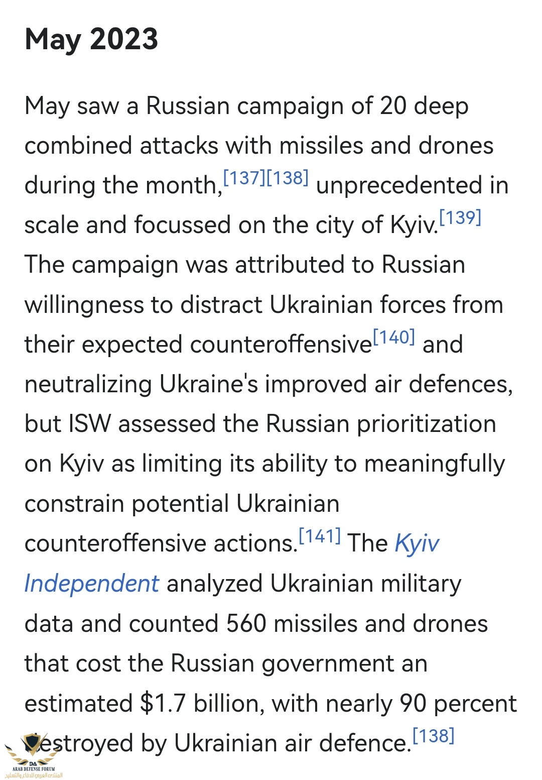 وإنما كان هناك استهداف روسي للعاصمه كييف يوم ٣ / ٥ / ٢٠٢٣ حيث تم استهداف مخازن الذخيره التي عادة ما تكون تحت الارض بقنابل صاروخيه روسيه ودرونات من طراز شاهد طبقا لقائمة ويكيبيديا التي تُحصي الهجمات الروسيه على العاصمه الأوكرانيه كييف مشاهدة المرفق 608549