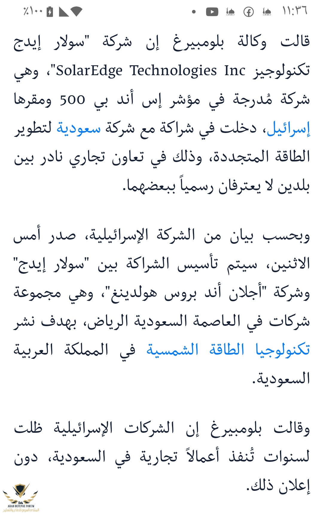 و الاكيد ان شركة solar edge الإسرائيلية وقعت اتفاق مع السعودية في مجالات الطاقة