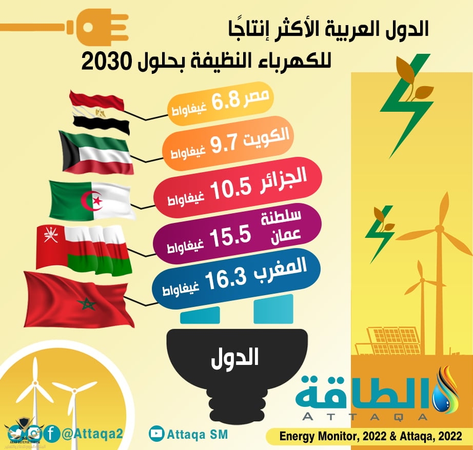 تونس يعتبر الانتاج ضعيف و الى الآن نعتمد على الغاز لكن السنوات القادمة مبشرة خاصة ان العديد من المحطات المنتجة للطاقة الشمسية سيتم افتتاحها في صحراء توزر كما تم فتح المجال امام الشركات الخاصة للقيام بمشاريع و بيع انتاجها للدولةمصر و المغرب و الإمارات على رأس القائمة.. ما أكثر الدول العربية إنتاجًا للكهرباء من الطاقة المتجددة ؟مشاهدة المرفق 609909
