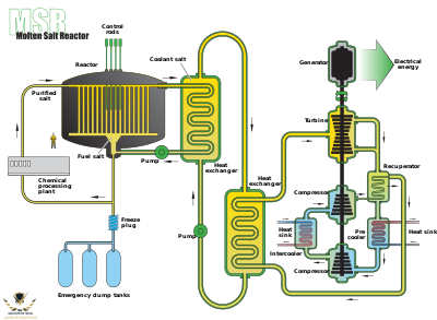 إلا أنها تعتمد جميعاً على أملاح الفلوريد المنصهر المخزنة تحت ضغط منخفض. وتتكون من خليط من أملاح الليثيوم وفلوريد البريليوم المذاب في فلوريد اليورانيوم المخصب. ويستخدم المفاعل الغرافيت لتوجيه تدفق الملح عند درجة حرارة 700 درجة مئوية. وتؤدي الحرارة الناتجة عن الوقود إلى إنتاج البخار الذي يعمل على تشغيل العنفات فتولد الكهرباء. ويعد مفاعل فلوريد الثوريوم السائل أحد أشهر مفاعلات الملح المنصهر، والذي يستخدم الثوريوم واليورانيوم المذاب في ملح الفلوريد.مشاهدة المرفق 615946