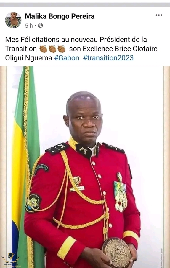 مليكة بونغو ابنة الرئيس علي بونغو تهنئ الجنرال بريس أوليغي نغيما بتوليه منصب الرئيس الانتقالي للبلاد خلفا لوالدها علي عمر بونغو، الرئيس الغابوني المخلوع.
