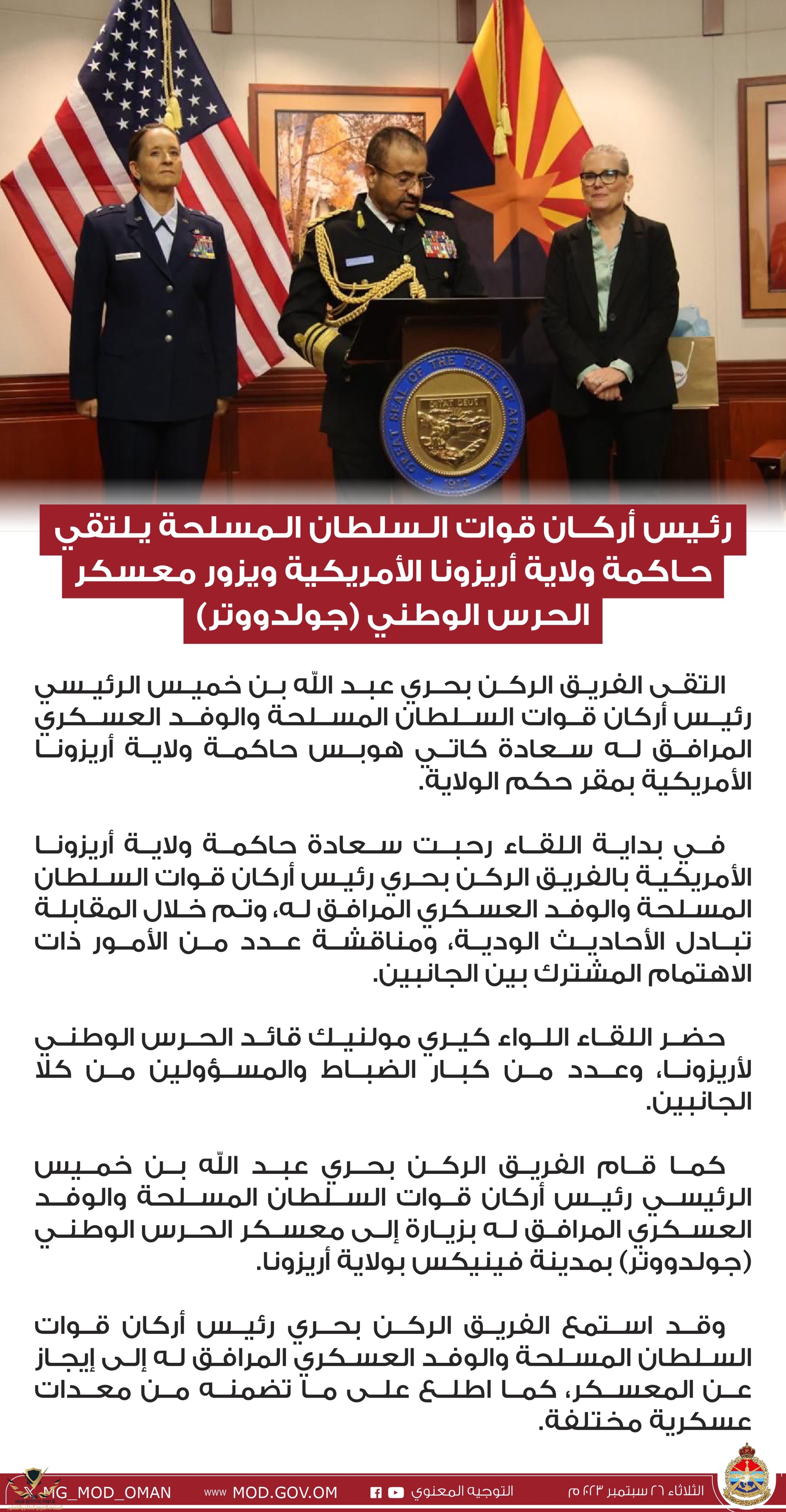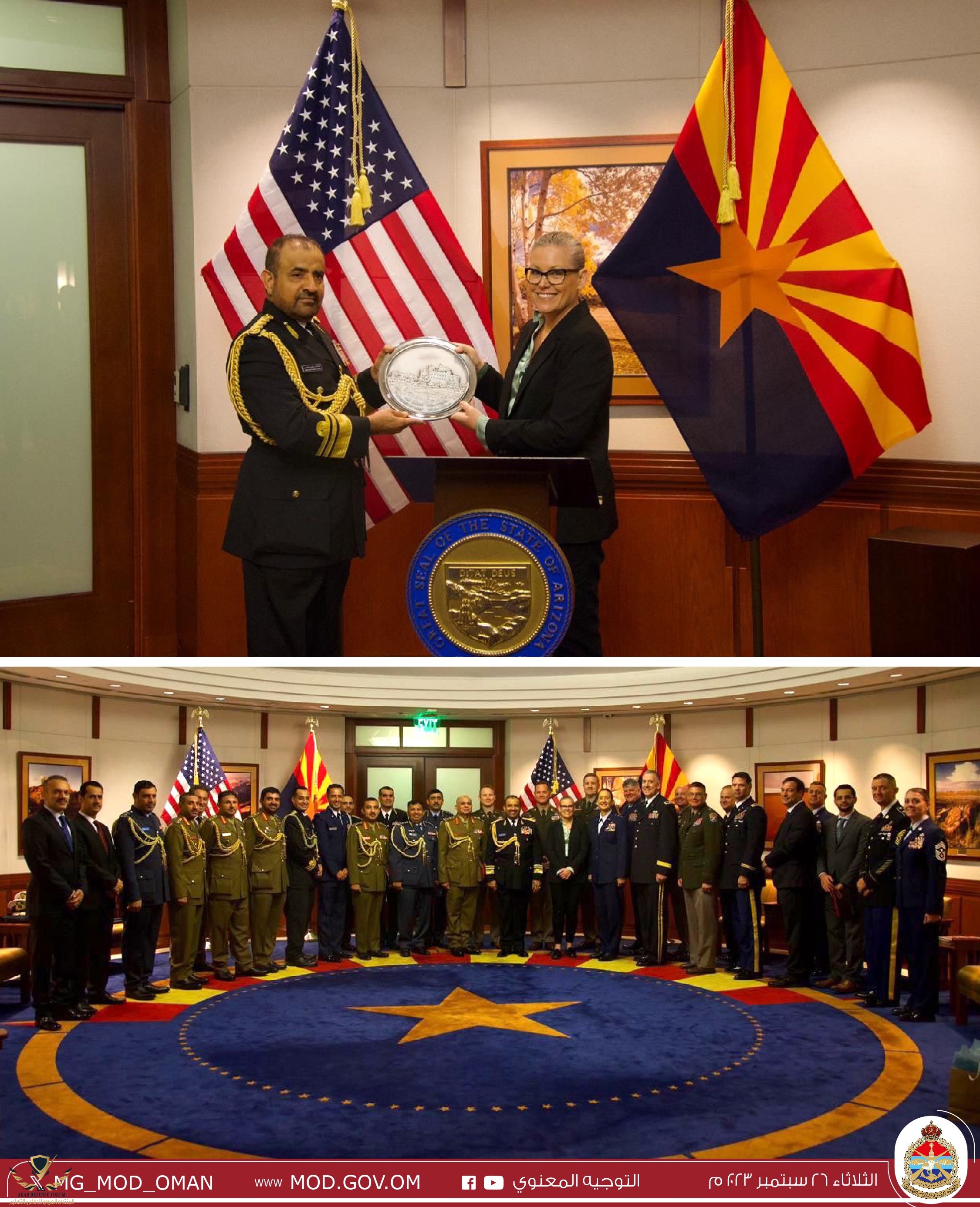 أريزونا في 26 سبتمبر /العُمانية/ التقى الفريق الركن بحري عبدالله بن خميس الرئيسي رئيس أركان قوات السلطان المسلحة والوفد العسكري المرافق له، سعادة كاتي هوبس حاكمة ولاية أريزونا الأمريكية بمقر حكم الولاية.