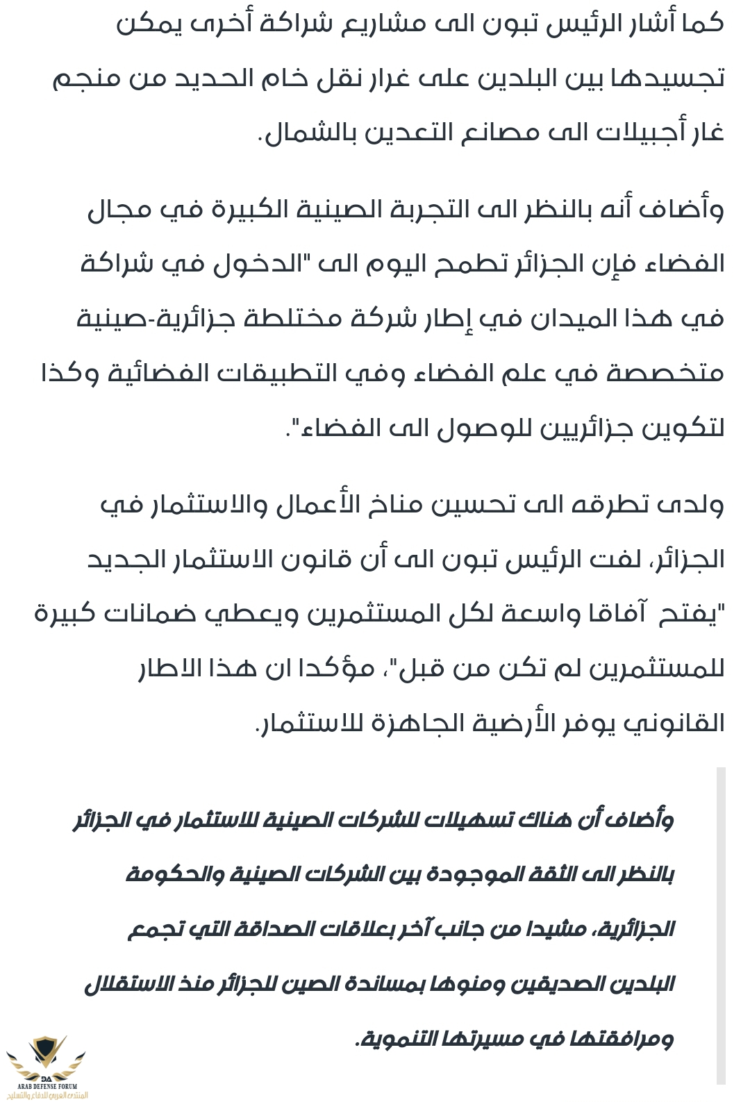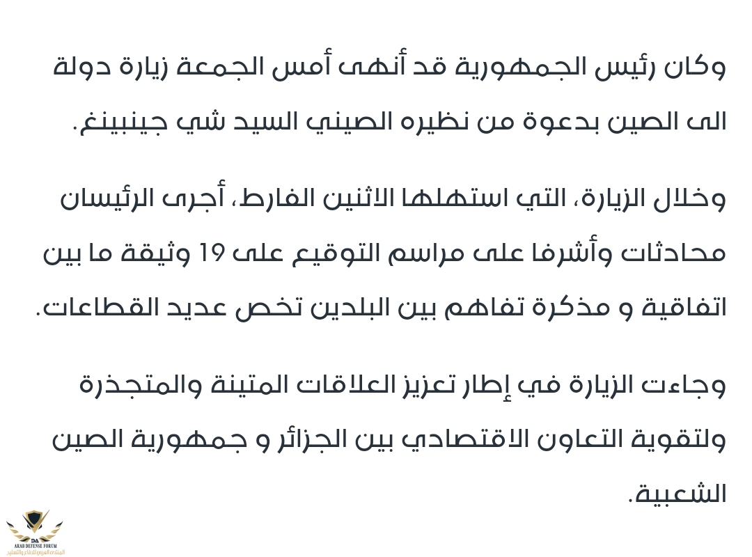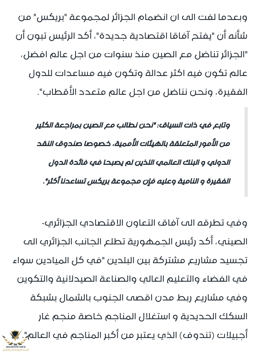 الانضمام لتكتل اقتصادي احد نقاط التي وعد بها الرئيس تبون .....وطبعا الانضمام ممكن يكون مفيد لك او العكس .....على كل لو اني مكاانه امشي البلد بعقلية الاترااك...وين ما تكون مصلحتي اكون...مش ابقى لاصق في القطب واحد دائمايقال ان قاده الصين وروسيا والهند والبرازيل لا ينامون الليل بعد هذا التصريح مع كامل حبى للجزائر والكل يعلم هذا لكن تصريح انفعالى وغير موفق انت من بحاجه لهم وليس العكس الافضل الا تغلق الباب لكى لا تندم
