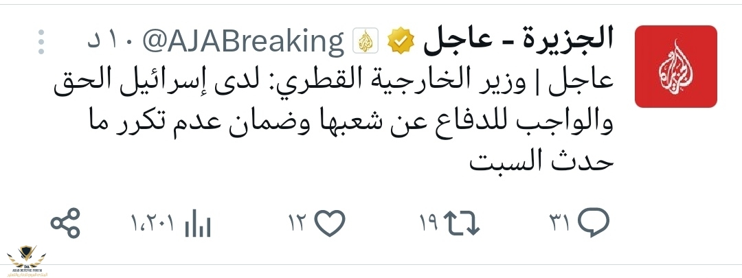 ان اسرائيل لها الحق بما تفعله منسوب لوزير خارجية قطر ... اتوقع خطأ .. راح فيها المحرر بقناة الجزيرة![]()