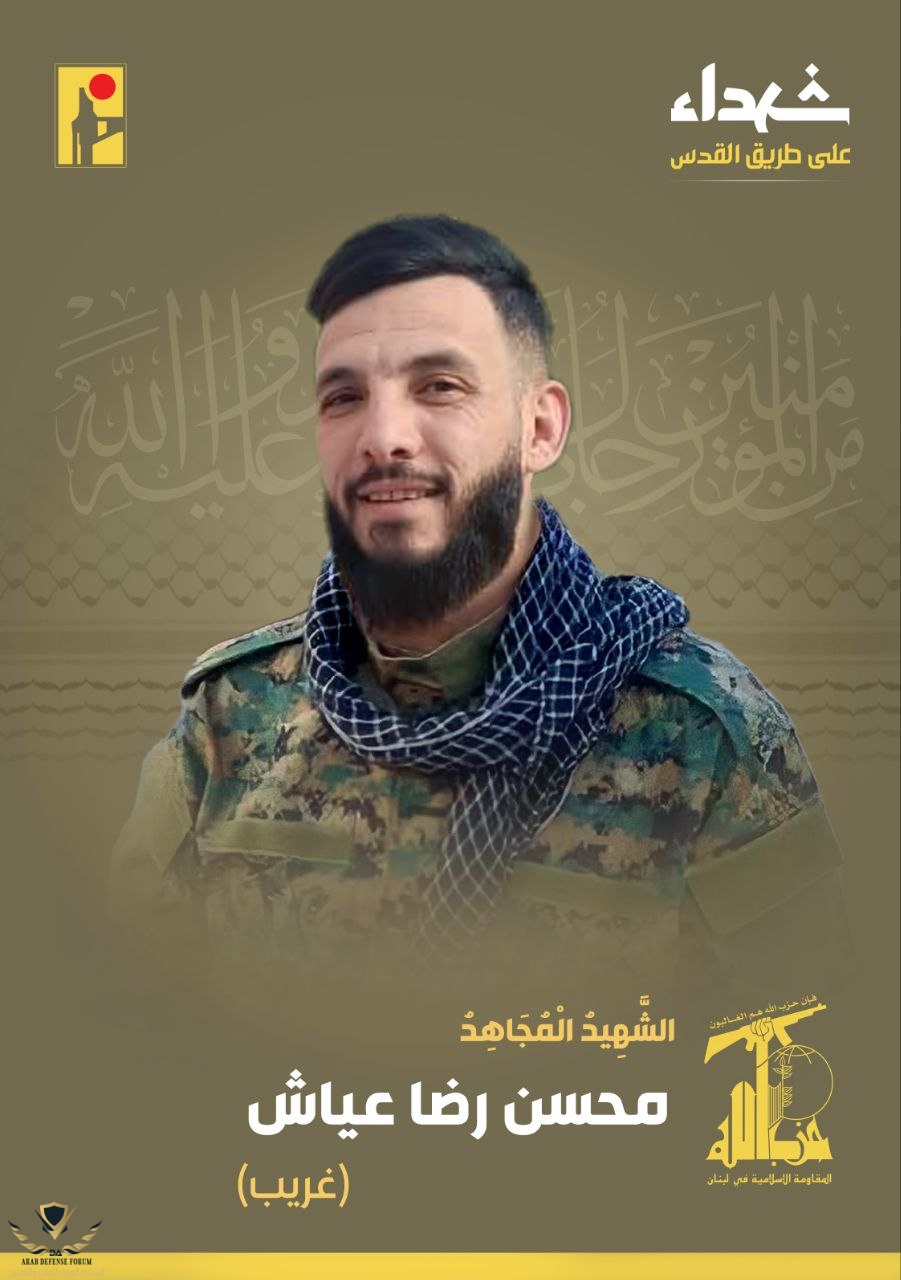 بمزيد من الفخر والإعتزاز، تزف المقاومة الإسلامية الشهيد المجاهد محسن رضا عياش "غريب" من بلدة حاروف في جنوب لبنان، والذي ارتقى شهيداً على طريق القدس.