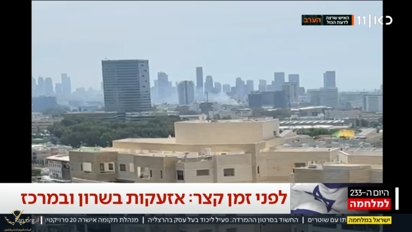 القناة الـ 12 العبرية , بثت فيديو سقوط صاروخ في منطقة مفتوحة في غوش دان (خارج المناطق الحضرية) وأكدت أن الضربات استهدفت غوش دان وشارون وسط تل ابيب الكبرى (الكبرى اشارة الى كل المناطق العمرانية والمدن المحيطة بالمركز).