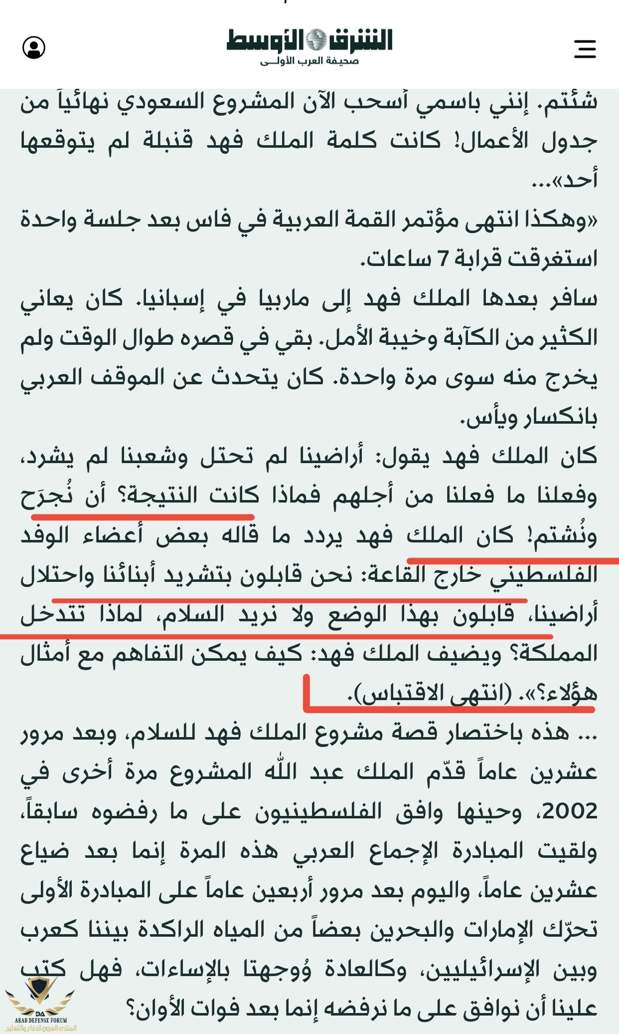اللي رفضو مشروع الملك فهد هم نفسهم اللي اتو بمشروع اوسلو وتنازلو لإسرائيل ودخلو بحكم ذاتي ورقي برضاهم وبكامل قواهم العقليه وعلى قلبهم زي العسل