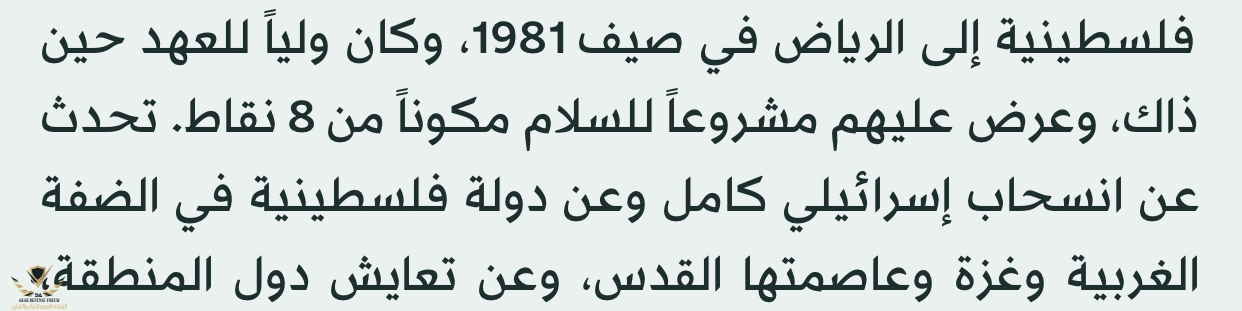 مبادرة الملك فهد نفس مباردة الرئيس السادات تقريبا فليه يقبلوها منه وبالمناسبة الملك فهد لم يطلق مبادرته الا بعد بدء انسحاب اسرائيل من كامل سيناء باستثناء نقاط علي الحدود تم استرجعها بعد ذلك فالملك فهد الحقيقة انه اتاخر في مبادرته ولو تم تبنيها لرفضت كما رفضت مبادرة الملك عبد الله بعد ذلكفتي