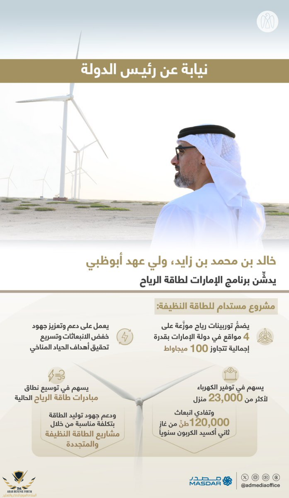 نيابة عن صاحب السموّ الشيخ محمد بن زايد آل نهيان رئيس الدولة، حفظه الله، دشَّن سموّ الشيخ خالد بن محمد بن زايد آل نهيان، ولي عهد أبوظبي رئيس المجلس التنفيذي لإمارة أبوظبي، خلال فعالية أقيمت في جزيرة صير بني ياس في أبوظبي، برنامج الإمارات لطاقة الرياح. ويعكس هذا المشروع المستدام حرص القيادة الرشيدة وإيمانها الراسخ بأهمية الاعتماد على مصادر الطاقة البديلة، منذ إطلاق أول مشروع من نوعه في دولة الإمارات ومنطقة الخليج من خلال إنشاء محطة توليد الطاقة بواسطة الرياح في جزيرة صير بني ياس عام 2004.