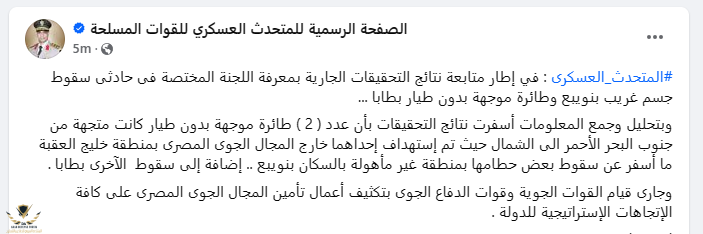 المتحدث الرسمي للقوات المسلحة المصرية: في إطار متابعة نتائج التحقيقات الجارية بمعرفة اللجنة المختصة فى حادثى سقوط جسم غريب بنويبع وطائرة موجهة بدون طيار بطابا ...