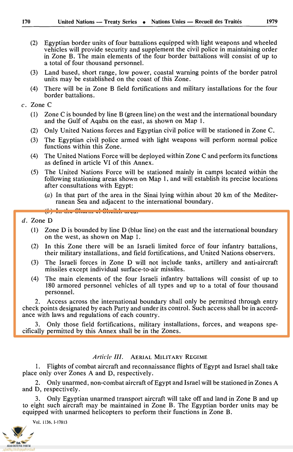 Zone D: Israel is allowed to hold: 4 infantry battalions, with military installations and fortifications, and UN observers. Israel is NOT allowed to have tanks, artillery, anti aircraft missiles except "individual" SA missiles (MANPADS?), the force will contain up to 180 APCs of all types and will be less than 4,000 personnel total. (Note: Zone D is such a narrow strip of land that it is not really of importance. I think the Zone was added to show good spirit and mutual concessions, as well as give a quotable "DMZ" to the Egyptian public opinion)