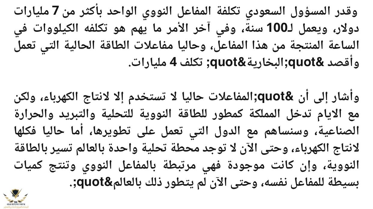 كلام جميل ولكن اشرح له لماذا لان الماء المحاط بمياه المفاعل الثقيل قسم صغير منه يخرج بخار الى التوربينات والباقي بالامكان الاستفادة منه في تحلية المياه وهي كمية هائلة جداً اعتقد هناك كلام على فكرة تحلية المياه في الضبعة ايضاًالمفاعلات ممتازة لتحلية مياة البحر