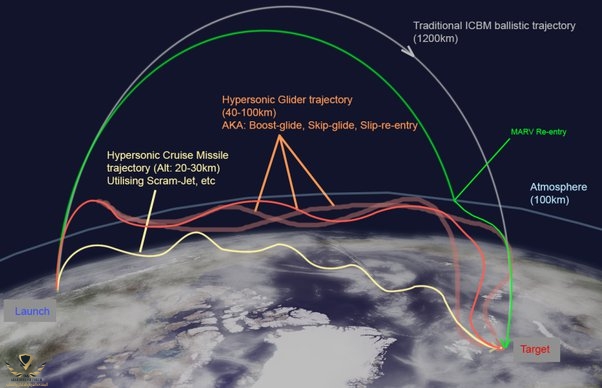 مشكور اخي على التوضيح وهذه الصوره هديه لك وللاخ abdo 22 @abdo 22 وللجميع ،، اظن ان هذا الرسم يعطي فكره لاباس بها عن الفرق بين المسارات flight profiles لصاروخي فتاح-1 و 2 .... اللون الاخضر فتاح-١ (مع مناوره اضافيه خارج الغلاف الجوي ايضا حسب ادعاء الايرانيون) ... المسارات باللون الاحمر لصاروخ فتاح ٢ .... اللون الاصفر HCM صواريخ الكروز الهايبرسونيك بمحركات ال Scramjet... مع التحيه.