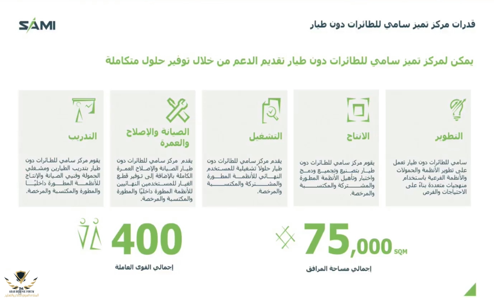 وإكمالاً للجهود الوطنية السابقة ولمواكبة التقدم التقني في هذا المجال، عملت شركة SAMI منذ تأسيسها على بناء قدرات تطوير وتصنيع منظومات الطائرات المسيرة كجزء من مستهدفات رؤية المملكة 2030 لتوطين 50% من الإنفاق العسكرى من خلال استراتيجيتها لبناء قدرات التطوير للمنظومات وأنظمة المهام المتعددة لعدد من المنظومات، بالإضافة لرفع الجاهزية التقنية لمنظومات أخرى، وتجهيز قدرات الإنتاج التسلسلي والكمي وعمليات الدمج والموائمة والاختبار للمنظومات في مرافق التصنيع داخل المملكة بمساحات تزيد عن 30,000 متر مربع، والتي ستشغل بشكل كامل وفق أعلى المعايير العالمية، بالإضافة لتفعيل قدرات التشغيل المنظومات لصالح الجهات المستفيدة، وتقديم خدمات الصيانة والإصلاح للمكونات الهيكلية والميكانيكية والإلكترونية للمنظومات وتدريب الطيارين ومشغلي الحمولات وفنيي الصيانة في "مركز تميز سامي للطائرات بدون طيار.