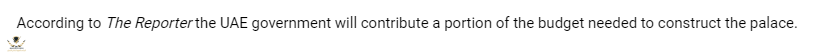 الترجمة " ووفقاً لصحيفة The Reporter، ستساهم حكومة الإمارات العربية المتحدة بجزء من الميزانية اللازمة لبناء القصر."