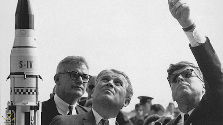 فيرنر فون براون (في الوسط) في عام 1961 مع زملائه من علماء عملية مشبك الورق الذين يعملون على صاروخ ساتورن.