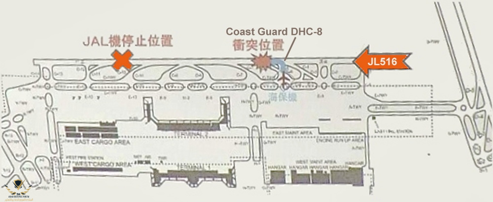 وفقًا لخفر السواحل الياباني أن طائرة خفر السواحل اليابانية التي اصطدمت بطائرة JAL هي طائرة ثابتة الجناحين ترميزها MA722 مخصصة لقاعدة هانيدا الجوية. كان هناك ستة أشخاص على متنها ، تم الاتصال بأحدهم، لكن سلامة الخمسة غير معروفة ويسارع خفر السواحل الياباني للتأكيد.