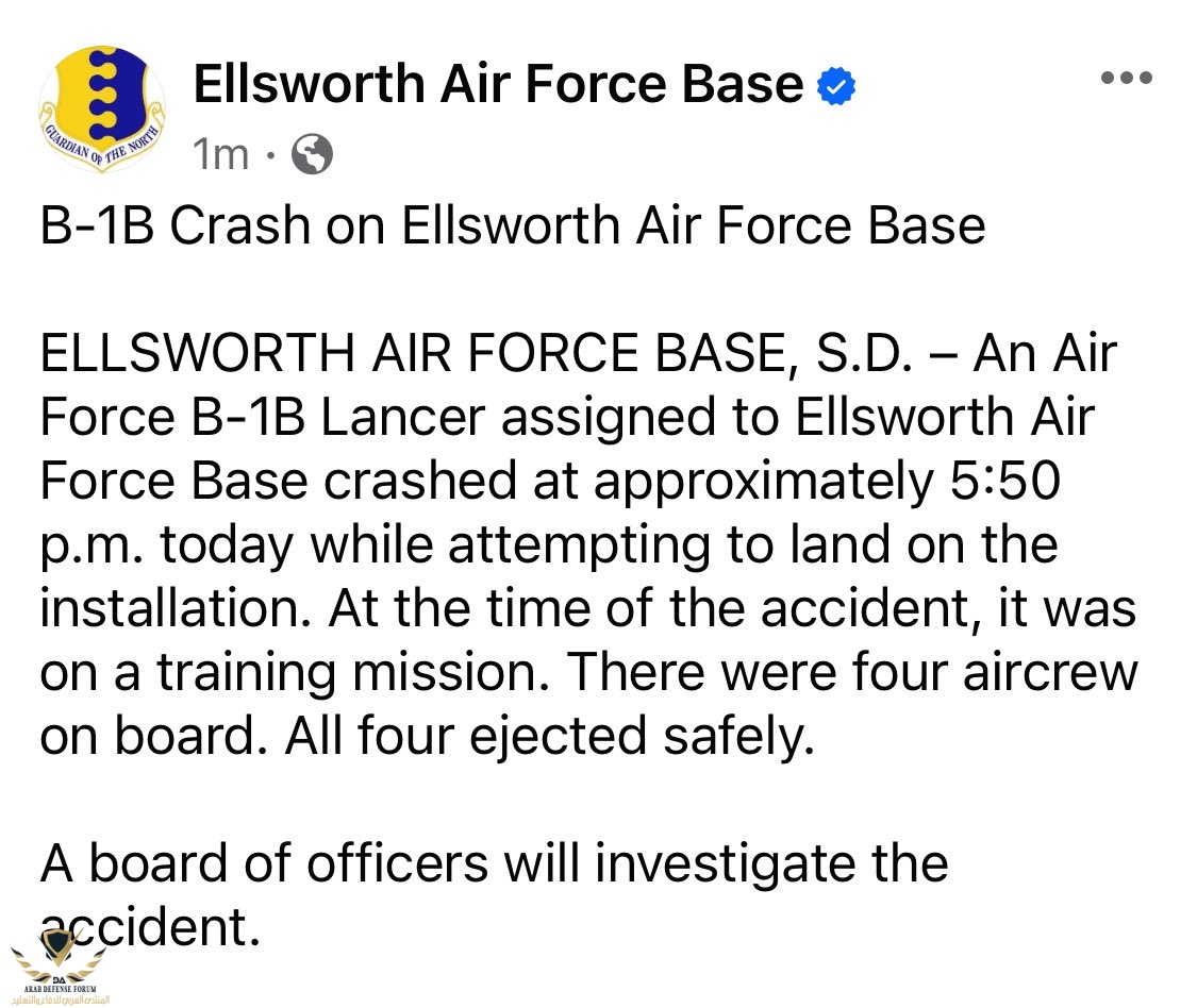 تحطمت قاذفة قنابل من طراز B1 خارج قاعدة إلسورث الجوية